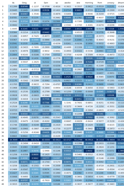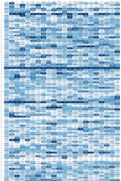 import pandas as pd import dataframe_image as dfi import torchfrom transformers import GPT2Model, GPT2Tokenizerimport matplotlib.pyplot as pltmodel_name = "gpt2"tokenizer = GPT2Tokenizer.from_pretrained(model_name) model = GPT2Model.from_pretrained(model_name, output_attentions=True, output_hidden_states=True)model.eval()text = "As Gregor Samsa awoke one morning from uneasy dreams he found himself transformed in his bed into an enormous insect" inputs = tokenizer(text, return_tensors="pt")input_ids = inputs.input_ids tokens = tokenizer.convert_ids_to_tokens(input_ids[0])title = [] for i in range(len(tokens)): add = str(i) + ": " + tokens[i] title.append(add)with torch.no_grad(): outputs = model(**inputs)attentions = outputs.attentionsfinal_hidden_state = outputs.hidden_states[-1]hidden_matrix = final_hidden_state.squeeze(0) df = pd.DataFrame(hidden_matrix.numpy(), index = title) df_styled = df.style.set_properties(**{'max_cols': -1}) df.to_csv("C:/Users/musta/Desktop/final_hidden_states_with_labels.csv")print('done')
