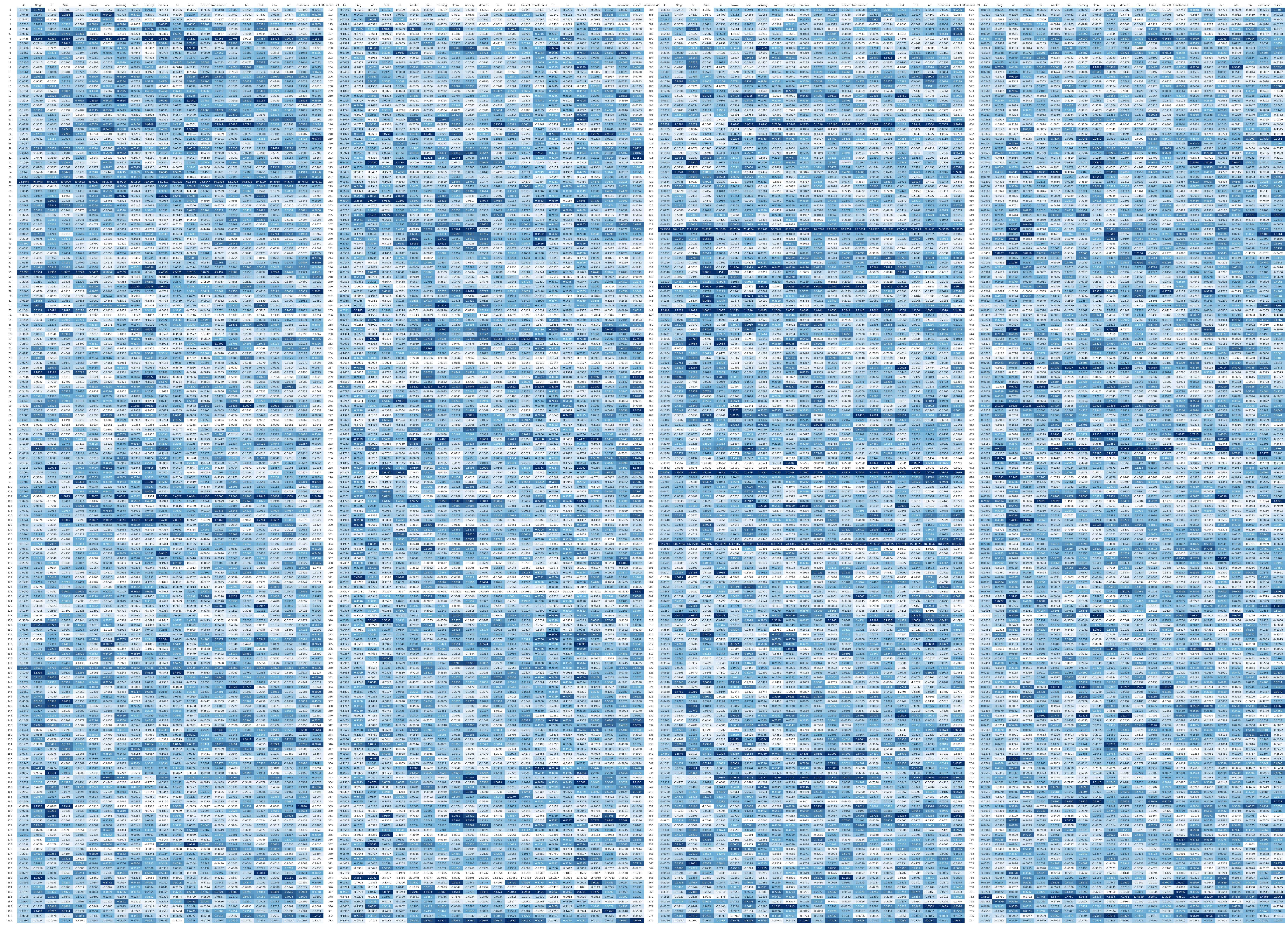 import pandas as pd import dataframe_image as dfi import torchfrom transformers import GPT2Model, GPT2Tokenizerimport matplotlib.pyplot as pltmodel_name = "gpt2"tokenizer = GPT2Tokenizer.from_pretrained(model_name) model = GPT2Model.from_pretrained(model_name, output_attentions=True, output_hidden_states=True)model.eval()text = "As Gregor Samsa awoke one morning from uneasy dreams he found himself transformed in his bed into an enormous insect" inputs = tokenizer(text, return_tensors="pt")input_ids = inputs.input_ids tokens = tokenizer.convert_ids_to_tokens(input_ids[0])title = [] for i in range(len(tokens)): add = str(i) + ": " + tokens[i] title.append(add)with torch.no_grad(): outputs = model(**inputs)attentions = outputs.attentionsfinal_hidden_state = outputs.hidden_states[-1]hidden_matrix = final_hidden_state.squeeze(0) df = pd.DataFrame(hidden_matrix.numpy(), index = title) df_styled = df.style.set_properties(**{'max_cols': -1}) df.to_csv("C:/Users/musta/Desktop/final_hidden_states_with_labels.csv")print('done')