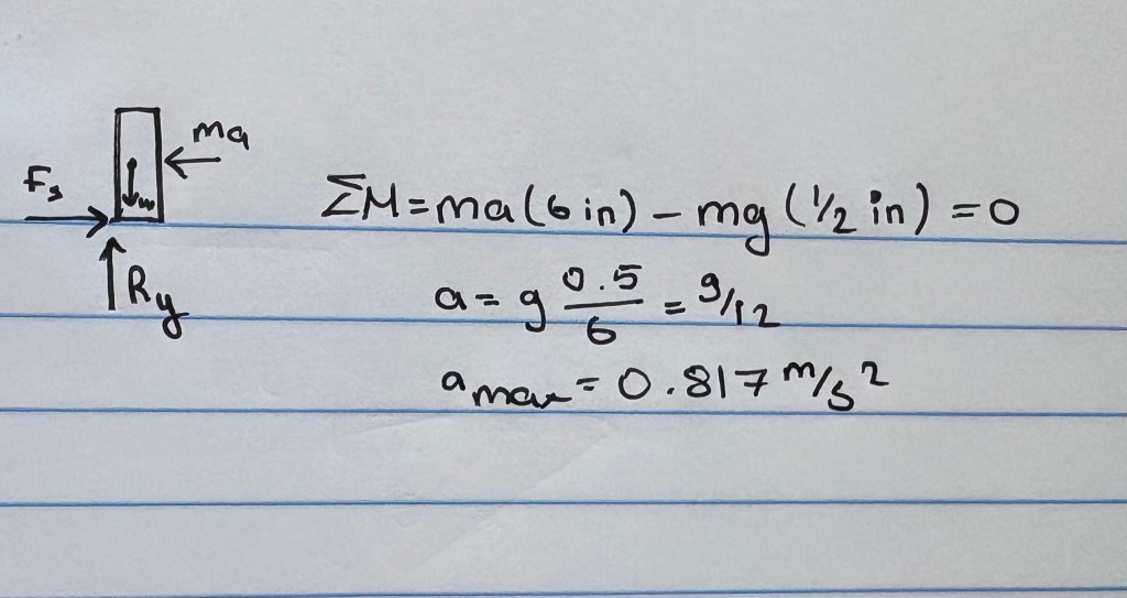 first, i calculated by hand the maximum horizontal acceleration the bar could tolerate without toppling. modeling it as a rigid body supported at its base, i found a theoretical limit of 0.817 m/s². this became the benchmark for everything that followed.