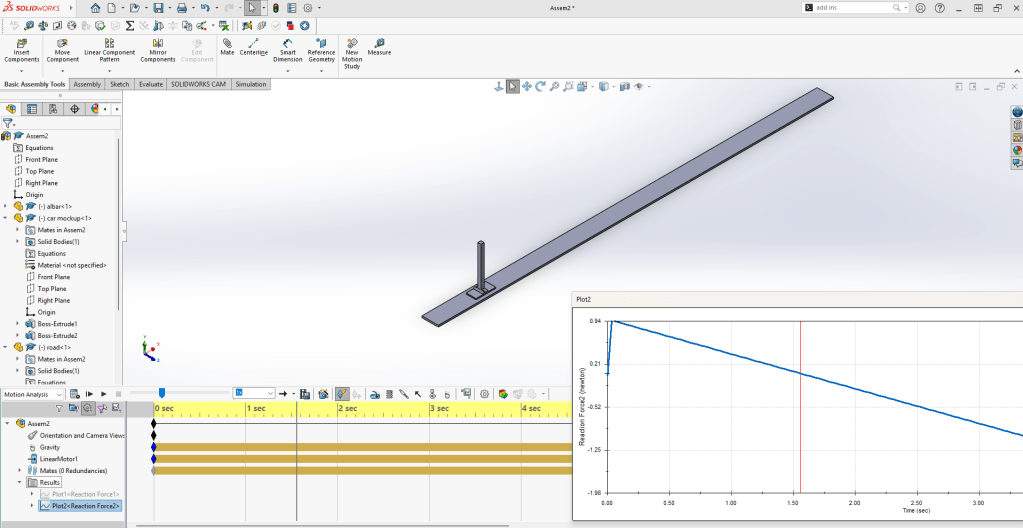 then i built a simplified solidworks model of the platform and bar to validate that number. by applying horizontal acceleration and tracking when the reaction force at the edge of the base dropped to zero, i confirmed the same tipping threshold. the simulation matched the hand calculations, which gave confidence that the model captured the core dynamics.